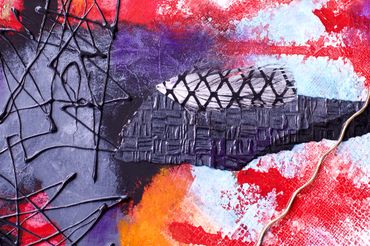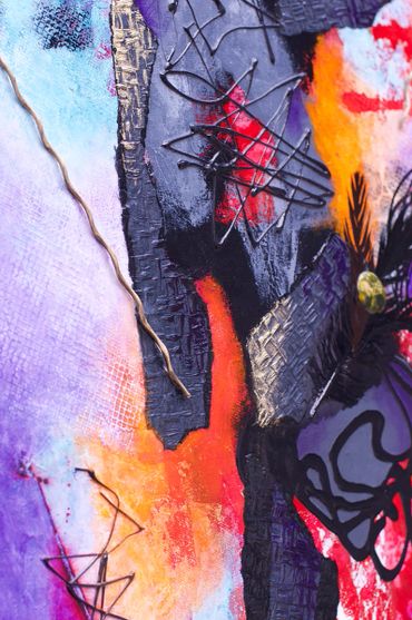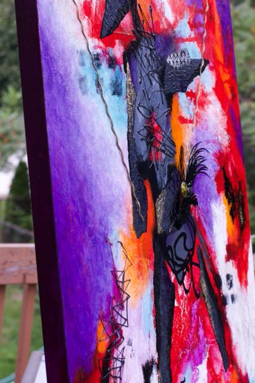 Colorful and textured painting with some elements incorporated in the piece (feathers, plants, handmade pebbles, paper). Very glossy finish. The sides are painted, it’s wired and ready to hang. A certificate of authenticity is issued upon purchase.