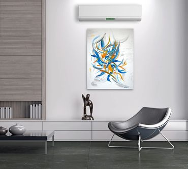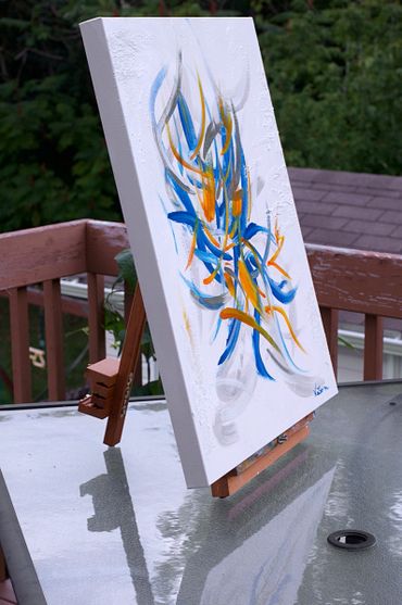 Light and lively abstract painting with a touch of sandy texture. The artwork has a light sheen finish. The sides are painted. The piece is wired and ready to hang. It is signed by the artist and a certificate of authenticity is issued when purchased.